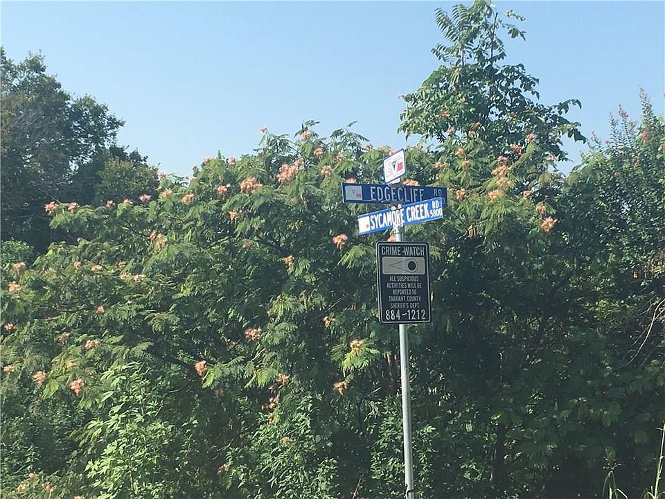 3.55 BEAUTIFUL TREED ACRES WITH APPROX 575 FT OF FRONTAGE ON EDGECLIFF ROAD AND APPROX 175 FT OF FRONTAGE ON SYCAMORE CREEK ROAD. THIS ACREAGE HAS BEAUTIFUL HARDWOODS OF MANY DIFFERENT VARIETIES AND SEASONAL CREEK. BRING YOUR PETS, GROW YOUR GARDEN AND ENJOY THE NATURE. DON''T MISS OUT ON A OPPORTUNITY TO OWN LAND IN TARRANT COUNTY AT A GREAT PRICE. UNDEVELOPED AND SOLD AS IS.