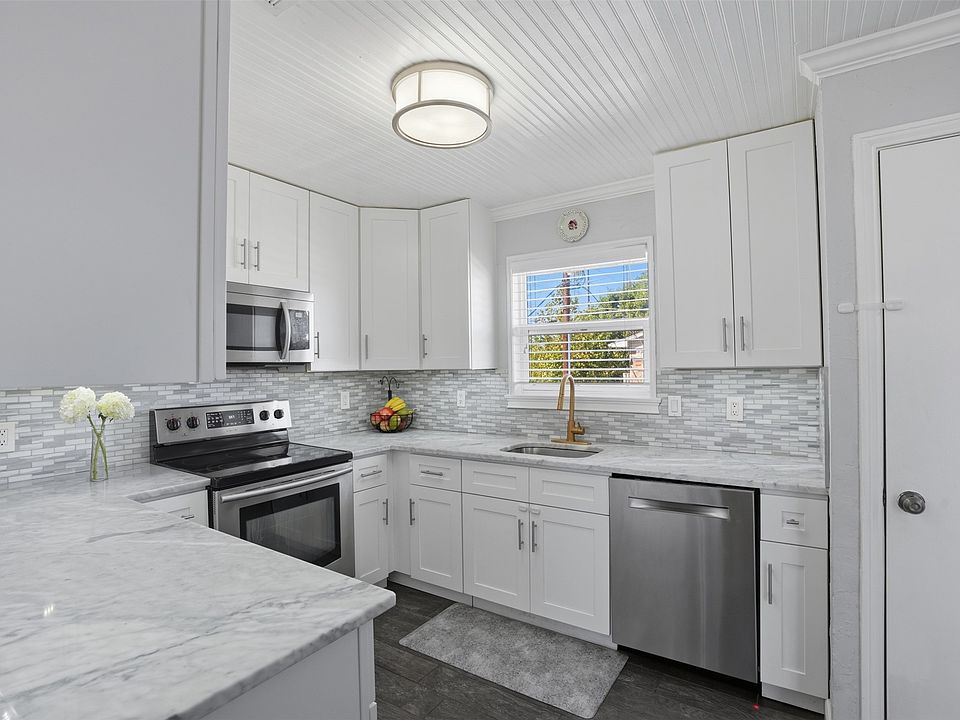 Updates include: Wood-look ceramic tile flooring throughout, stylish details like wainscoting, chair rail, and beadboard ceiling, stainless steel appliances and modern lighting fixtures. Frameless glass shower door and Nest thermostat. Faux wood blinds and upgraded hardware. Energy efficient Low-E windows. Both bedrooms feature generous walk-in closets. HUGE private patio balcony makes for great outdoor