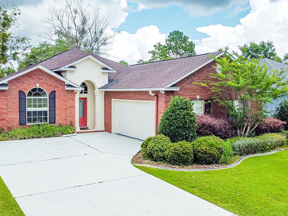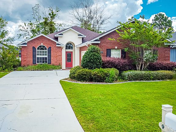 Large 3 bed / 2-bathroom open flow, Gorgeous custom built Brick Home with all tile and hardwood flooring, and a 2 1/2 car garage. This home features a split bedroom floor plan, great room with 12' ceilings. Entering the front door, the dramatic foyer has 12' ceilings that lead into the large great room with bay windows, an electric fireplace, and even a built-in surround system. Ample sized kitchen offers SS appliances, granite countertops, and lots of cabinet space for a pantry and other storage. The large master bedroom is completed with an en-suite bathroom with a corner Whirlpool garden tub with a New Frame-less separate shower and an in-wall electric fireplace to complete the ambiance. Finishing it off is the Dual walk-in separate his/hers closets.with his having an in-floor safe for that extra safety hide-a-way if needed. Right outside your back door, you will be greeted by the inviting backyard. It is fully fenced in and has a hardscape patio with a custom built-in pergola. Washing machine and dryer left for convenience. Home prewired for First Alert alarm system if you choose to have one. Conveniently located to the I10 off-ramp, several military bases, 1.4 mile to the closest boat ramp, 22 min to Blackwater river sports, 24 min to Naval Air Station Whiting Field, 45 min to Hurlburt Field. Sorry no cats, but dogs will be considered with a full pet application. Lease includes landscaping services.