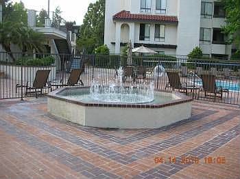 Terrific condo unit with large planter (not fence) enclosed ground-level patio facing east and looking between the buildings at Riverwalk Golf Course. Underground, well-lit community garage and this unit has a tandem space near the elevator and mailbox. Gated community with guard at vehicular entry. Stacked W/D, big kitchen with counter space for stools, fireplace in main room, storage closet off patio, wood floors except carpet in bedrooms. Near the community room and pool. Fwys/shopping nearby!