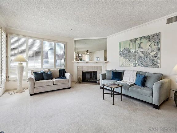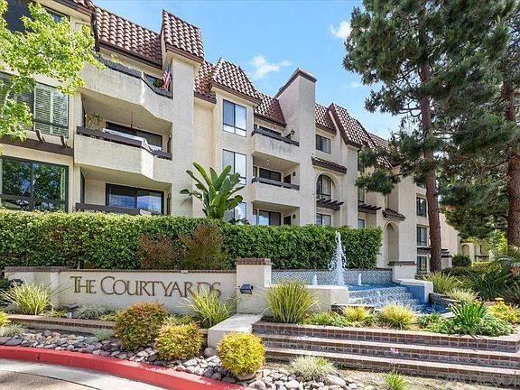 Top-floor, corner unit in The Courtyards at Mission Valley. This spacious 2 bedroom condo features a generous living area with large windows, making this unit light & bright inside and waiting for your personal touches. Private balcony with storage closet overlooks the open courtyard and pool area and is a great space for taking in the fresh air and sipping your favorite beverage. The large kitchen with recessed lighting is big enough for dining in and has plenty of cabinets for storage. The primary bedroom has a large, south-facing window and the ensuite bathroom features an updated shower, recessed lighting and walk-in closet. This unit also has central heating & A/C. Two assigned parking spots in the gated garage. The Courtyards have 2 pools, a spa/hot tub, tennis courts, on-site security and manicured grounds with fountains & gazebos. Convenient access to highways, schools, shopping, dining, entertainment, Downtown SD, beaches, Sea World and so many more amenities San Diego has to offer!