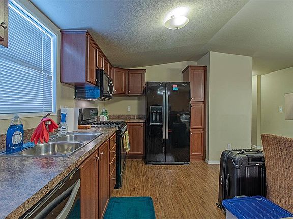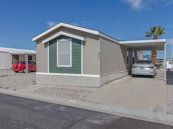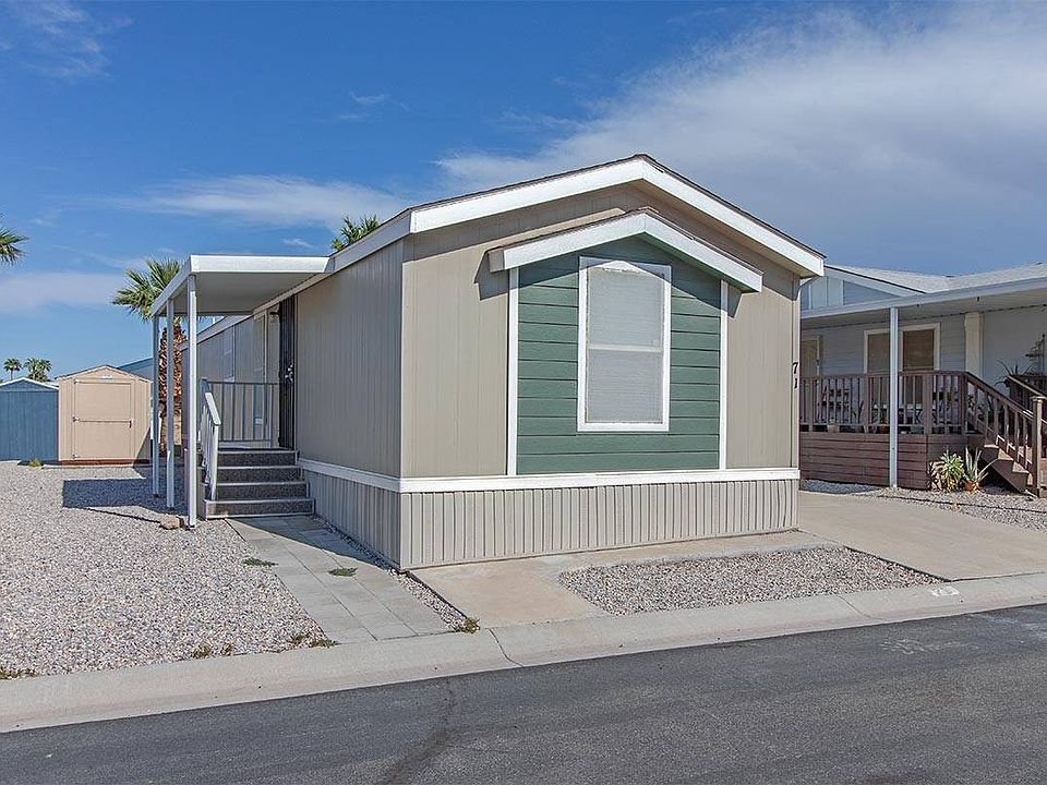 15.33x56 2 bedroom 2 bathroom manufactured home For Sale in a land lease manufactured home community. The home is located on a large home-site with low-maintenance landscaping. It has a shingle roof, and onsite covered parking under the attached carport. There is also a front patio awning and a Tuff Shed at the rear of the home-site. This is a split floor plan with bedrooms and bathrooms at each end of the home. The living room and kitchen are in the center of the home. The laundry area is just inside the back door of the home just past the kitchen. This home has laminate flooring with carpet in both bedrooms. The entire home has tape & textured drywall, vaulted ceilings, upgraded doors and factory installed overhead lighting in every room. There are ceiling fans in both bedrooms as well as the living room. The kitchen is an eat in kitchen with plenty of cabinet and counter space. All of the existing major appliances are included. The front (guest) bedroom is easily queen-size and includes a walk-in closet and lighted ceiling fan. The guest bathroom has a tub/shower combo, vanity and toilet. The master bedroom is located at the rear of the home. It has a large reach-in closet with his and hers doors, a lighted ceiling fan and an en-suite bathroom. The bathroom includes a garden tub/shower combo vanity and toilet. NOTE: Those applying for residency in Jaycee Park must meet the following criteria: Jaycee Park is age and income-restricted. Residents must be 55 years of age or older. To qualify, 2 people can't be earning more than $33,000 per year. Applicants must have lived in the state of Nevada for the previous 6 months. This home is in pretty nice condition and is currently being cleaned out and prepared for new owners. Monthly home-site rental in this community is currently only $255.00 per month.