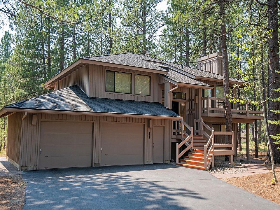 Surrounded by towering Ponderosa, backing to a large open common area, and across the street from the Deschutes National Forest, is this classic Sunriver home. For those seeking a well-maintained home in a quieter corner of Sunriver, this is it. With a reverse living design, vaulted cedar ceilings, and large windows surrounding the living space, you will feel like you are sitting in the trees! Front and rear decks allow you to soak up the sun or read in the shade...you decide. And you'll have plenty of room for your family and friends as there are 4 bedrooms, 2 en suite. Numerous updates are throughout, including both kitchens & bathrooms, as well as a recently installed AC and hot water tank. Master suite is also vaulted with a cedar-lined ceiling, plus has a generous bathroom with a large walk-in closet, soaking tub, and walk-in shower. The extra wide garage allows space for extra bikes, golf clubs or shop area.