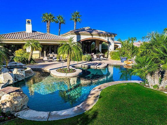 Live every day like a luxury vacation in the prestigious guard-gated community of Andalusia at Coral Mountain, where resort comforts, serene desert beauty, and first-class club amenities blend into an exceptional way of life. Nestled against the dramatic Santa Rosa & Coral Mountains, this private residence offers a peaceful sanctuary with unforgettable natural surroundings and seamless indoor-outdoor living designed to inspire relaxation and connection.Wake to quiet mornings framed by panoramic mountain views, and take in the soft glow of sunrise over the fairway. Enjoy coffee on your patio as the sun warms the peaks, then step out your door and embrace a lifestyle tailored to wellness, leisure, and social connection. With full social membership included in the HOA, residents enjoy access to the clubhouse, dining venues, state-of-the-art fitness & wellness facilities, racquet sports, resort pool, spa services, dog park, and miles of scenic walking and biking trails. A stunning 18-hole Rees Jones championship golf course winds through the community, with optional golf memberships available.Inside the home, tall ceilings, abundant natural light, and large view windows create a refined yet relaxed atmosphere ideal for everyday comfort and entertaining. The kitchen serves as the heart of the home, flowing into generous great-room and dining spaces perfect for gathering with friends after a day on the courts, links, or trails. The private primary retreat offers a peaceful haven for unwinding, complete with spa-inspired bath and dual walk-in closets. Two additional ensuite guest rooms in the main house ensure comfort for visitors, while the two-room casita with living room and bedroom offers the perfect space for extended stays or private work/wellness use.Step outside to your own personal resort environment. A sparkling pool and spa with cascading waterfalls create a tranquil backdrop for sun-soaked afternoons, while the built-in BBQ and covered patio areas set the stage for evening dining under glowing mountain silhouettes. Lush landscaping, open skies, and breathtaking views create a sense of calm and escape that defines life at Andalusia.Whether lounging poolside, enjoying a fitness class, connecting with neighbors at community events, or ending the day with golden mountain sunsets, this is desert luxury living at its finest -- a home where every moment feels like a retreat.