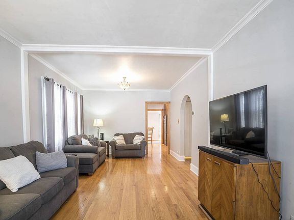 Professional photos & Video tour coming soon! Main floor has a small foyer leading to the living room/dining room combo that has crown molding and original Maple hardwood flooring that is in good condition. Large modern eat-in kitchen with plenty of cabinets, recessed lighting & newer appliances, door that goes to the enclosed porch. 1st floor also includes one bedroom with hardwood flooring and a full bathroom that was updated in May 2025. 2nd floor has 3 bedrooms with newer Oak hardwood flooring, a 2nd full bathroom, that is also updated. Full unfinished basement has a laundry area with new utility sink/tub (2024) and plenty of storage. All water pipes replaced, and the sewer replaced at the stack to the Buffalo Box in the street in Sept. 2024. Windows replaced in 2016. Central AC was serviced June 2025. Fenced yard has a 2 car garage.