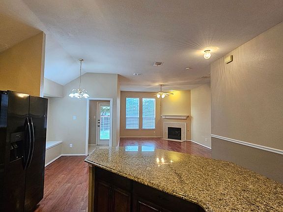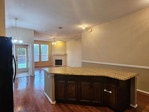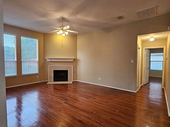 Corner fireplaceWood privacy fenceOpen floor-planWood floorsFormal denRear entry garageSplit bedrooms