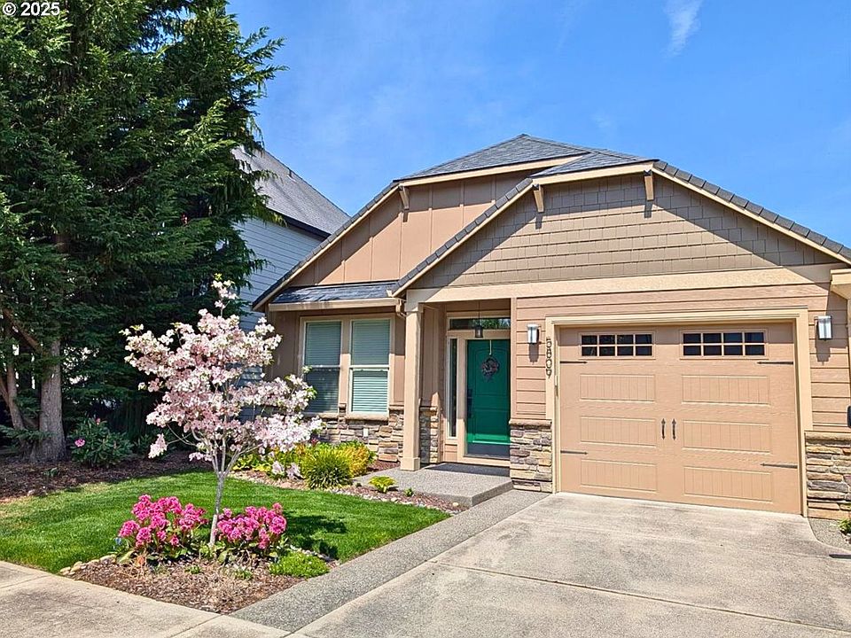 Move-In Ready in a beautifully maintained gated Camas community. Located minutes from 192nd Avenue, shopping, dining, and daily conveniences. This thoughtfully designed one-level home with minimal stairs, offers 1,663 square feet of functional elegance in a private neighborhood. Step inside to find a light-filled, open-concept layout with vaulted ceilings and well-integrated architectural details. The spacious living room features large windows, a gas fireplace framed by custom built-ins. The kitchen is tailored for both everyday living and entertaining, with stainless steel gas appliances, quartz counters, a generous island with space for seating, and a walk-in pantry. The primary suite is a quiet retreat, enhanced by vaulted ceilings and oversized windows that fill the room with natural light. The attached ensuite features double vanities, a roll-in shower, and a large walk-in closet for maximum comfort and convenience. Two additional rooms - a second bedroom, and a large bonus room—ideal for a home office, den, or media space. A second full bath with tub is nearby and easily accessible. Additional features include a separate utility room with washer and dryer, built-in cabinetry, and a utility sink. Subtle yet refined details such as alcoves, integrated lighting, molding accents, a built-in sound system, and well-placed clerestory windows add character throughout. Enjoy the outdoors from the covered deck and fully fenced yard—perfect for relaxing or entertaining in any season. No backyard neighbors is a lovely bonus. This well-maintained home is part of a quiet, friendly community with low HOA dues—ideal for those seeking comfort, security, and convenience without compromising on style.