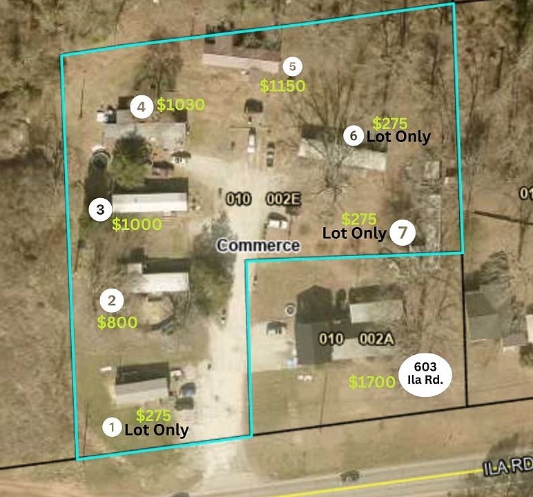 Motivated seller make us an offer! Owner financing available with 50% down! Income producing mobile home park in a great area! 581 Ila Rd has 7 units on 1.67 acres, Units 1, 6, and 7 pay monthly lot rent and units 2, 3, 4, and 5 are owned by the park. 603 Ila Rd is a 2248 sq ft 4 bedroom, 2 bath homes on it's own .47 acre parcel. The property adjoins a large tract that has been approved for a residential development and is located close to Hwy 441 and downtown Commerce. The homes are metered individually for power and the tenants pay their share of water each month. Professionally managed currently. There is one unit that the tenant just moved out of. Call Agent for more details!