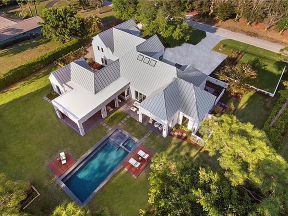 The Pine Ridge Estates neighborhood is now one of the most popular in Naples for its rural aesthetic, abundant privacy, and larger lot sizes. Its close proximity to the beach, fine dining, and shopping make for the perfect blend of serenity and activity. Not only are you across from Mercato, Waterside Shops, and Vanderbilt Beach, but you are only a 6-minute drive to 5th Avenue downtown. It is now rare to find a luxury property within this neighborhood in such a central location as 581 Myrtle Road, with no major road noise and Southwest backyard sunsets. Cited in the very center of the popular 94-acre, equestrian style neighborhood, this home has proven to be superbly resilient to hurricanes, both in expert construction and with its rare 16.3’ elevation above sea level. This is the first of several ‘Modern Farmhouse’ luxury homes in Pine Ridge from developer R.O.I. NAPLES that carved a compelling new niche in the market for unique materials, bespoke interior design finishes, and Hamptons-inspired architectural details. Winner of multiple Sand Dollar and Aurora Awards in both interior/exterior design and detailing, this is an opportunity to own a rare, New England aesthetic here in Naples. A standing seam metal roof, formed cement style portico, stucco board and batten siding, and oversize, hurricane-rated windows/doors throughout establish this bespoke style. Six Ipe decks and old growth trees compliment the 40’ pool/spa and the outdoor kitchen and living areas. Once inside, it’s the warmth of European oak herringbone floors, the artistic use of reclaimed hemlock on feature walls, and the 23’ tall pitched great room ceiling perched above your eye level that immediately halt your search for a home with an emotional connection. Not a typical 'model home' built to appeal to the masses, 581 Myrtle Road was designed to organically attract that rare and discerning buyer who walks in, recognizes that it is unlike anything else on the Naples market, and appreciates the extensive and unique luxury details throughout. Having a large ‘in-law suite’ on the first floor is perfect for visiting family members. On the second story, two ensuite bedrooms with 12’ vaulted ceilings and a family room with wet bar, optimally maximizes every inch of this near 6K square foot home which was designed and built for comfort and style. Architectural plans already drawn within the setbacks for a 2-story detached guest house.