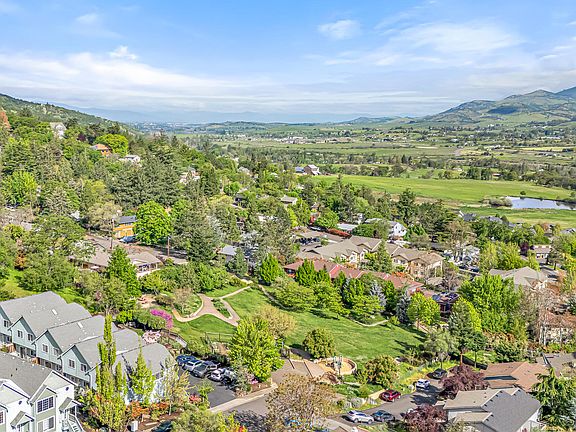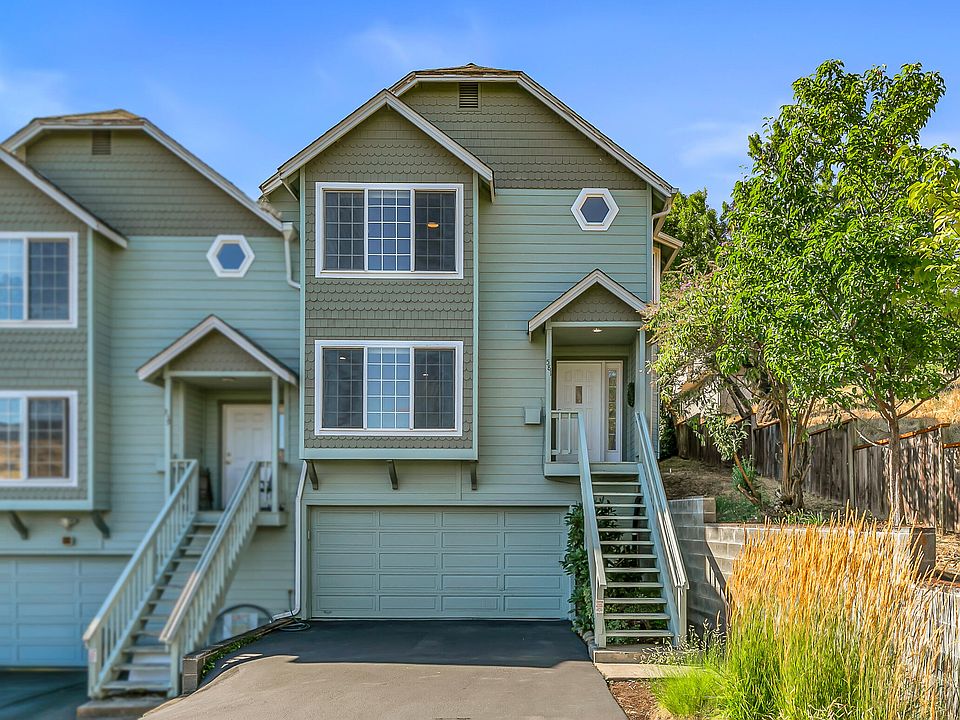 Updated end-unit condo with lovely mountain views and abundant natural light — steps from community gardens, picnic tables, walking paths, and playgrounds of dog-friendly Scenic Park! Solid oak hardwood entry, living room with mounted flat screen and sound bar, gas fireplace, window bench, and half bath with washer and dryer. Kitchen with new stainless GE range oven and counter-depth Samsung refrigerator; dining area with sliding glass door to fully-fenced private backyard. Vaulted primary suite with walk-in closet and ull ensuite bath with double vanity and tub shower, two guest bedrooms with closets, and full guest bath with tub shower. All new ceiling fans, carpets, and large-format waterproof vinyl tile floors throughout. Interior stair to lower-level garage and large finished bonus room. Nine-unit association covers all exterior maintenance including roof, gutters, siding, paint, stairs, annual window cleaning, fencing, parking, and common area landscaping. Inquire for details!