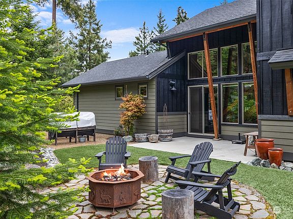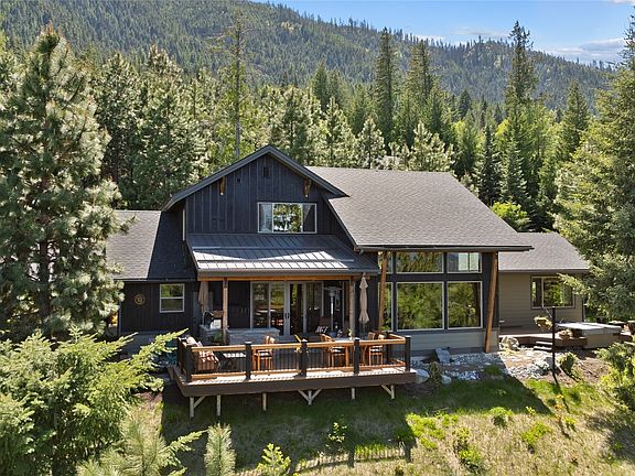 This stunning NW artisan-style retreat, on a premium view lot, offers truly extraordinary outdoor living spaces & an expansive 4-bay garage w/ 288 sft heated hobby room/addl living space. The meticulous home features exposed beams, soaring ceilings, open staircase & floor-to-ceiling windows w/unparalleled Stuart Mnt views. Spacious kitchen boasts a gathering island w/quartz countertops, SS appliances & gorgeous wood floors. Primary suite on main, w/guest room & media/bunk room upstairs. Expansive deck w/outdoor kitchen, addl deck w/hot tub & backyard patio w/custom firepit. Fully landscaped w/raised garden beds. Perfect for full or PT living. Trailside at Woods & Steele is a gated mountain community w/Lodge, swimming pool, hot tub & trails.