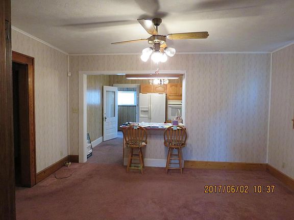 Nice one floor plan house with living room with decorative fireplace, dining room, kitchen with appliances and breakfast bar, 1st floor laundry, 2 bedrooms, 2 car detached garage, Executor says hardwood floors under carpet
