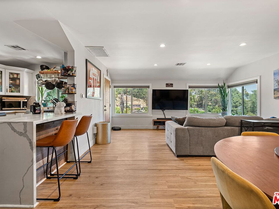 In the hills of Highland Park, this remodeled cottage-style home offers sweeping hillside and mountain views from nearly every room. The main level features two bedrooms with custom closets, light-blocking blinds, and serene outlooks, while the open living and dining areas flow into a bright kitchen with bar seating. The lower level includes a third bedroom with a private entrance, ideal for a home office, studio, gym, and a large additional storage space. Step out to a covered patio and garden that wraps to the front entrance, with mountain views as the backdrop. A backyard terrace above reveals panoramic DTLA views--perfect for extra parking, relaxing, or entertaining. Additional highlights include solar panels for energy efficiency, four parking spaces, and a prime location near hiking trails and just minutes to downtown, blending hillside tranquility with city convenience.