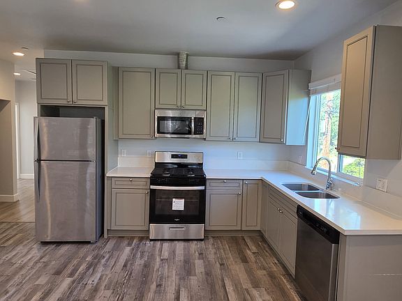 Stainless steel appliances: refrigerator, stove, dishwasher, and microwave