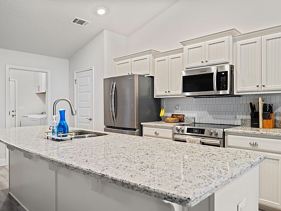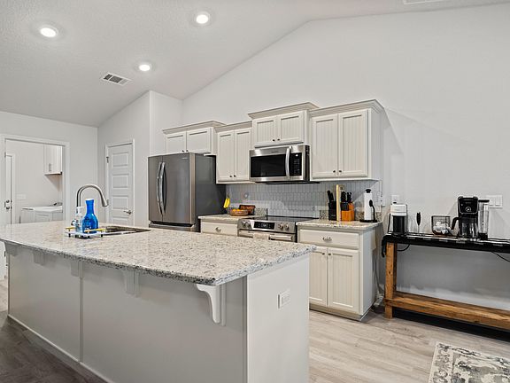 Welcome home to this stunning 4-bedroom, 3-bath, 2,313 sq. ft. all-brick residence perfectly situated on a 1/4-acre homesite in the desirable Silvercrest community. Designed for comfort and everyday elegance, this home offers a spacious split floor plan and an inviting open-concept living area with a cathedral ceiling and custom built-ins. The heart of the home features a chef-inspired kitchen with Ivory White granite countertops, antique white all-wood cabinetry, a beautiful tile backsplash, and an oversized center island ideal for entertaining or casual dining. The kitchen is equipped with Frigidaire Gallery Series stainless-steel appliances, including the refrigerator, range, microwave, and dishwasher.