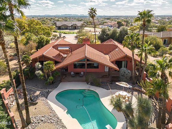 RARE OPPORTUNITY to own a home on horse property, with spectacular views of the Superstitions, and no HOA!! This property also already has a space for RV covered parking and a garage/workshop! A private courtyard welcomes you to the home which features large, dual-pane windows to take in the view, tiled flooring throughout, cedar lined closets, a new AC, new exterior and partial interior paint, jetted tub in master bathroom, and a finished basement with a bedroom and game room downstairs! Lots of storage throughout! Exterior features include a large, extended vaulted covered patio, and a diving pool. It's the best of two worlds- starry nights but just minutes from the US 60! Furniture available for sale outside of escrow.