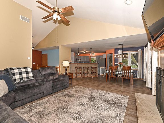 Finished look-out basementStylish lvp flooringRec roomSpa-like bathTile backsplashSoaring vaulted ceilingsCharming front porch