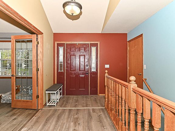 Open-concept ranch, situated on a wooded, fenced-in lot in Caledonia! This home greets you w/a charming front porch. Step inside to soaring vaulted ceilings & stylish LVP flooring. The kitchen w/breakfast bar features SS appliances, tile backsplash, pantry & built-in desk - perfect for meal planning or working from home. The adjoining dining & living spaces make entertaining a breeze. The primary suite offers a spa-like bath featuring a tile shower w/oversized tub, dual sinks & barndoor to WIC. Convenient 1st flr laundry. The finished look-out basement includes a family room w/electric FP, rec room, bath & 4th BR potential! Enjoy outdoor living from one of the 2 patio areas or relax under the gazebo. Major updates within the past few years: roof, furnace, water heater & sump pump w/backup