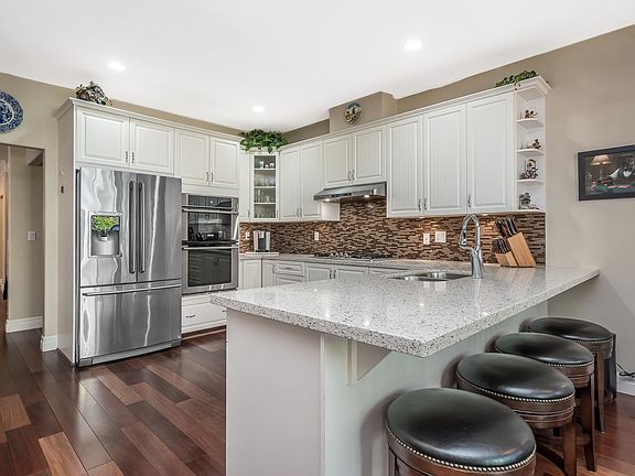 Huge covered back sundeckNew kitchenWhite cabinetsQuartz countersStainless steel appliancesBrazilian cherry hardwoodCrown mouldings