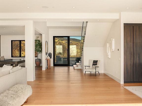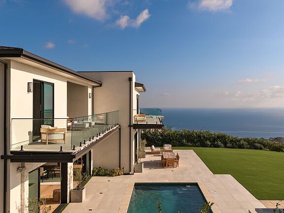 Enter through a striking glass pivot door and be greeted by breathtaking ocean views. This contemporary estate features an open floor plan, wide plank wood flooring, and soaring ceilings. A cascading waterfall enhances the tranquil setting.To the right, the entertainment area includes a bar with stone counters, built-ins, a reading nook, a mini fridge, and an ice maker. A pool and ping-pong table add to the fun. The space opens into the grand living room, where high ceilings, recessed lighting, a sound system, and a gas fireplace with a wood mantle create an inviting atmosphere. Sliding glass doors lead to the ocean-view backyard.The dining area offers built-in cabinets and a full-size wine fridge. The kitchen features white plank wood floors, dark wood cabinetry, and an oversized marble waterfall island with bar seating. Miele appliances, including a double oven, coffee machine, microwave, and dishwasher, ensure convenience. A five-burner Miele range, marble backsplash, hood fan, and pot filler complete the space. A push-to-open Thermador fridge and freezer add modern luxury.Off the kitchen, the laundry room has stone counters, tile flooring, and an LG washer and dryer. Across from the laundry, the home gym offers ocean views, wood floors, full-length mirrors, and a desk space. Sliding glass doors open to the backyard. The en-suite bathroom includes stone tile floors, stone counters, a shower stall with a detachable sprayer, and a rainfall showerhead. A powder room in the main living area features stone tile floors and counters.The first bedroom has wood floors, built-in cabinets, and sliding glass doors to a balcony with ocean and city views. Its en-suite bathroom features stone counters and a shower stall with dual showerheads. Another bedroom, with cabinets and counter space, includes an en-suite bathroom with marble counters and a shower stall. Both bedrooms access a shared deck.A grand staircase leads to the second floor, where a TV/sitting area provides a serene escape with panoramic ocean views. Built-in cabinets, stone counters, and shelves enhance functionality, while sliding glass doors open onto an ocean-view deck. To the right, an expansive outdoor deck offers waterfall and mountain views.A spacious bedroom on this level has wood floors, built-in cabinets, and sliding glass doors leading to the ocean-view deck. The en-suite bathroom includes stone counters and a shower stall. Another bedroom features high ceilings, a large closet with built-ins, and sliding glass doors to the ocean-view deck. The en-suite bathroom has stone tile floors, stone counters, and a shower stall.The primary suite offers uninterrupted ocean views through mitered glass windows and sliding glass doors opening to a private deck. A fireplace, reading nook, and two expansive closetsone with a keypad lockadd to its appeal. The primary bath features stone floors, a large shower stall with a rainfall showerhead, a double sink vanity with waterfall stone counters, and a freestanding tub positioned for ocean views. Two water closets, one with a bidet, complete the space.The backyard features an expansive lawn with ocean views, a charming orchard, and a pergola-covered fire pit seating area with two fire pits. The outdoor kitchen includes a bar, seating, stone counters, a mini fridge, a BBQ, and a one-burner range. A pool and Jacuzzi invite relaxation, while the partially covered deck provides dining and seating areas. Stone tile flooring adds elegance.The estate is completed by a three-car garage with parking for six additional vehicles. The landscaped front yard offers a bird-protected ocean view, enhancing the property's exclusivity.This exceptional residence embodies coastal luxury, blending sophistication, comfort, and breathtaking natural beauty in a refined format.