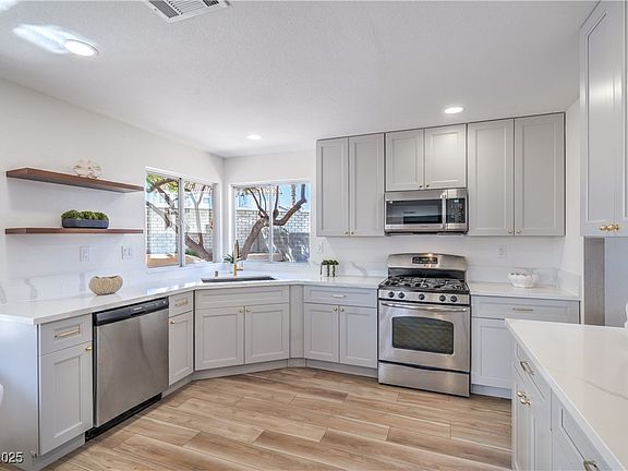 Enjoy this beautifully remodeled 2-story home featuring 4 bedrooms, no HOA, and a spacious backyard complete with a covered patio and storage shed. Step inside to find abundant natural light, vaulted ceilings, modern light fixtures, a custom tiled fireplace, painted accent wall, mirrored closet doors, and a mix of plush carpet and laminate wood flooring throughout. The upgraded kitchen offers garden views, gray shaker cabinets, sleek countertops with gold hardware, recessed lighting, and stainless steel appliances. Spa-like bathrooms showcase contemporary floating dual vanities, framed oval mirrors, designer lighting, and modern tiled showers with built-in niches and rainfall shower heads.