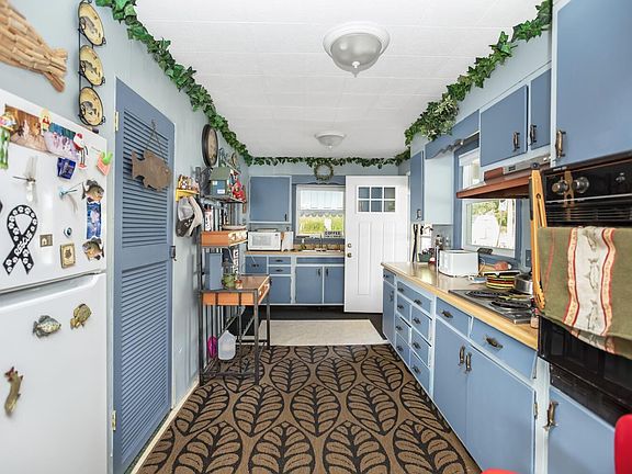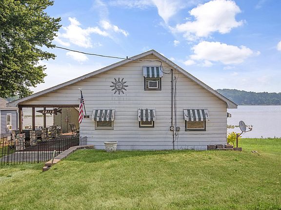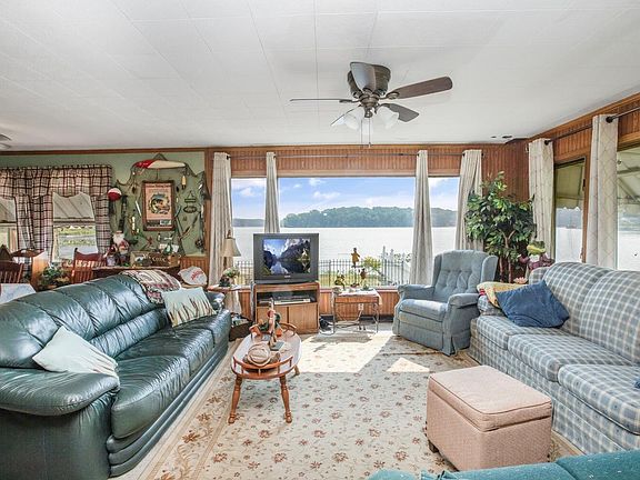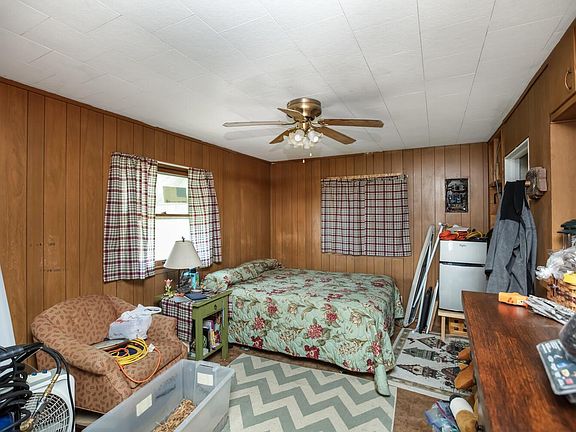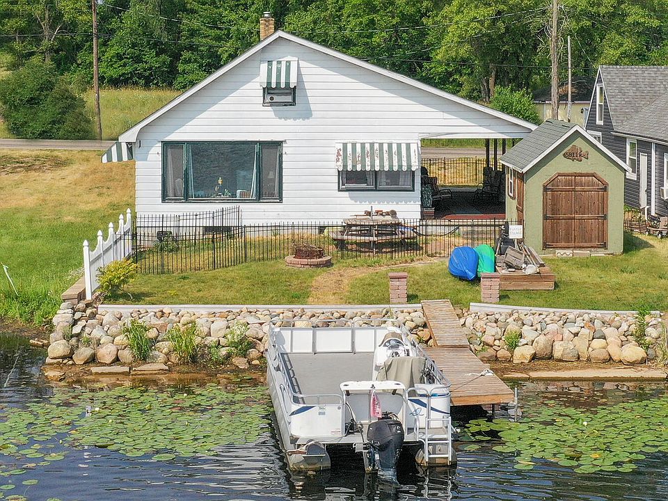 This two-bedroom, one-bath, 1,248-square-foot year-round cottage on all-sports Long Lake in Three Rivers has a stone seawall, a dock, a firepit, and a waterside storage shed for toys to enjoy the lake life. Inside, the main level has a living/dining area with panoramic views, a kitchen with access to a large covered patio, a paneled primary bedroom with a bath also accessible from the kitchen. Upstairs is a large bedroom with a vaulted knotty pine ceiling. The property includes a fenced yard and window awnings. Spring-fed 211-acre Long Lake is just over two hours from Chicago, less than an hour from Notre Dame.