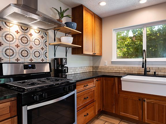 Toasty wood burning fireplaceModern farmhouse sinkManicured lawnAbundant storageShaker-style cherry cabinetryPrivate backyard sanctuaryUpdated open kitchen