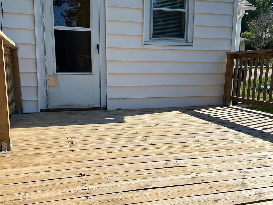 3 bedroom, 1 bath updated with fresh paint throughout. New kitchen cabinets, countertop, stainless steel sink dishwasher and electric range. Fridge is supplied also. New vinyl floor planking in kitchen and bathroom. Hardwood floors throughout the rest of the home. Nice size deck out the back door. Large walkout basement with freshly painted concrete walls and concrete floors. No smoking in property. Not section 8 eligible. First months rent and deposit required. Tenant responsible for all utilities, lawn maintenance & snow removal. One year lease minimum.No smoking and Not section 8 eligible. Small dog negotiable. No cats allowed.