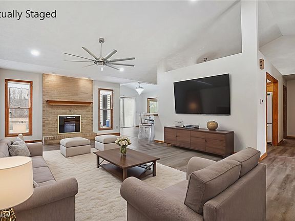 This well maintained ranch home offers three bedrooms and two full baths in an open inviting layout. the entry open to a bright interior highlighted by a dramatic great room with soaring ceilings and a stone fireplace. a dedicated dining area flows into the spacious kitchen, featuring a full appliance package, breakfast counter, and casual dining space. The owner's suite includes a private bath and walk-in closet. A second bedroom and full bath are complemented by French doors opening to a flexible room ideal for an office or third bedroom. Main level laundry, a vaulted sunroom, and a full basement with workshop space for added convenience and versatility. Additional features include a security system, central vacuum, 200 amp electrical service, and Cat 6 wiring. Ample parking and storage are provided by a three car attached garage, a three car detached garage, and a shed. Set on 5.5 scenic acres with views of the grounds and a creek from the deck, the property also features a 20' x 44' in-ground vinyl lined pool with updated filtration and plumbing, an SR Smith TurboTwister slide, and illuminated deck jets. A heavy duty anchored mesh safety cover ensures secure winterization. Included are a robotic cleaner, sweeper, and a copper ionization system that eliminates the need for salt and reduces chlorine use by up to 80%. A one year home warranty in included.