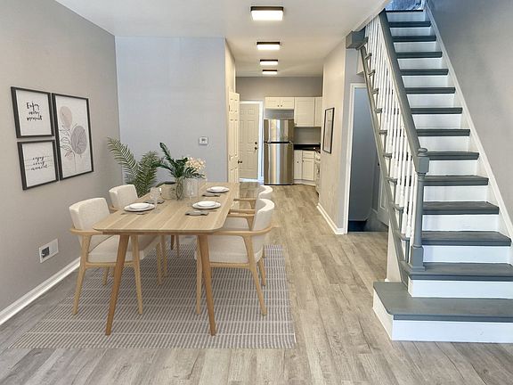 The dining area is large enough to accommodate a four-seat dining set and opens up directly into the kitchen which makes serving meals nice and easy. The kitchen looks gorgeous and includes white shaker-style cabinets with brushed nickel hardware, dark countertops, stainless steel refrigerator, and a four-burner gas range. There is also a subway tile backsplash which brings the entire design together!