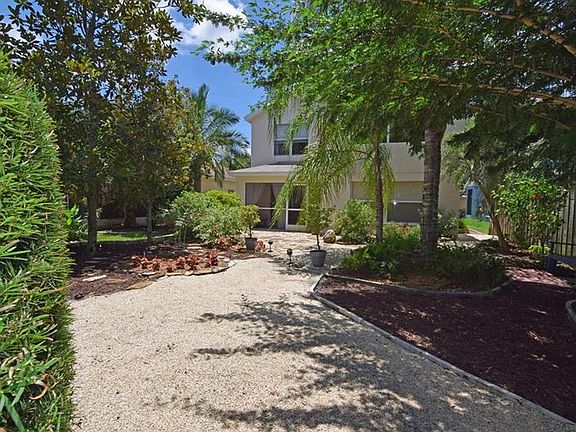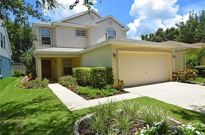 Wow! Tropical Backyard Escape - Immaculate with Beautiful finishes - Zoned for Bevis Elementary. This meticulously maintained 3 bedroom PLUS DEN gem is loaded with upgrades and boasts an amazing backyard oasis with tall graceful palms, privacy hedges and gathering spaces for entertaining or just relaxing. You will love the easy to maintain high-end laminate flooring found throughout the home (no carpet). The open family room is accented by a soaring two-story high ceiling, huge windows and large transom above that takes in the incredible view. The open kitchen boasts stainless appliances, glass mosaics, Corian counters, huge walk-thru pantry & breakfast bar. The owners suite offers beautiful views, deep walk-in closet, custom sliding screens, designer mosaic vanity, & garden tub with separate shower. Other features include: Hardwood on Stairs; Designer lighting fixtures; Custom lighted bookcases; Venetian plaster in guest bath; Stepping stones on side yards; Elegant custom screen blinds; Welcoming covered front porch; Cost-saving reclaimed water sprinklers; & Understair storage. It's just a short walk to Bevis Elementary, a National Blue Ribbon School. Fishhawk Ranch provides: Three Fitness Centers, Aquatic park with Water Slide, Multiple Pools, Clubhouses, Gamerooms with pool tables, Tennis Club with Competition Clay Courts, Park Square Shops, Sports Parks, Roller Hockey, Skate park, Basketball, 30 miles of trails, Playgrounds and A-Rated Schools.
