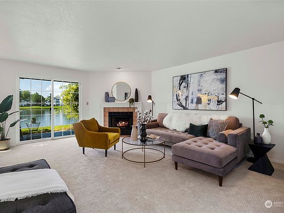 Waterfront living at the Lakes in Kent. This freshly painted & carpeted ground floor home has no stairs and a lovely patio next to the water for quiet living. An ideal layout w/central hallway opening to the large living & dining area w/cozy gas fireplace and access to the lakeside patio. The bedrooms are on opposite sides of the home for added privacy while the primary bedroom suite has large closets, full bath and beautiful lakeside views. Featuring a large, 1-car detached garage +1 dedicated parking spot, you are close to the Green River trail, Riverbend Golf Course, Russell Road Park, downtown Kent and transportation hubs. In-unit washer/dryer, storage closet on the patio and additional loft storage in the garage area added bonuses.