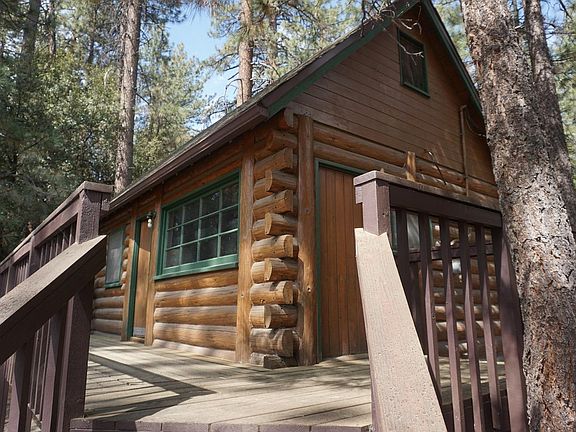 Super Cozy Log Cabin with tons of pine trees!!!! Large deck leading to the 1 bedroom, 1 bath cabin. Open living area with kitchen featuring knotty pine cabinets. Bedroom is located above in loft area . The loft has a very cool setup with mini storage closets as well. Newer Williams Fireplace -Look Heater. Very well kept property.