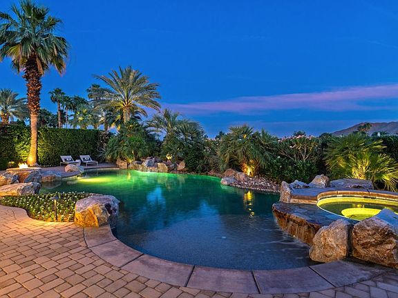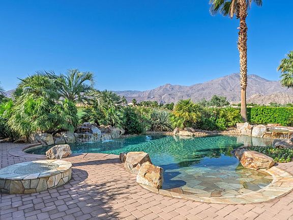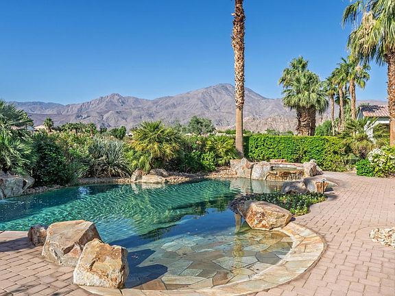 Experience refined desert living in this exquisitely appointed South-facing home, ideally located in the prestigious Andalusia Country Club. Perfectly positioned to capture unobstructed views of the Santa Rosa and Coral Mountains and the lush fairways of the Rees Jones-designed golf course, this residence offers a perfect harmony of refined style, relaxed living, and scenic beauty. From the moment you step through the private entry, you're welcomed into a thoughtfully designed interior, beautifully curated with designer furnishings and exquisite lighting that elevate every space. The open-concept layout flows effortlessly from the elegant great room to the chef's kitchen, complete with premium appliances and an oversized island ideal for entertaining. Stone flooring enhances the home's luxury, while walls of glass in the great room invite in abundant natural light and frame captivating views. The spacious primary suite is a private retreat, featuring a spa-like bathroom with dual vanities and generous walk-in closets. A detached two-room casita offers guests the ultimate comfort with its own fireplace, kitchenette, and private entrance. Step outside to discover a resort-style backyard designed for year-round enjoyment. A stunning saltwater pool with a spa takes center stage, surrounded by a covered loggia, built-in BBQ island, and inviting fire pit - perfect for sunset gatherings or stargazing under the desert skies. Come live the life you've always imagined!