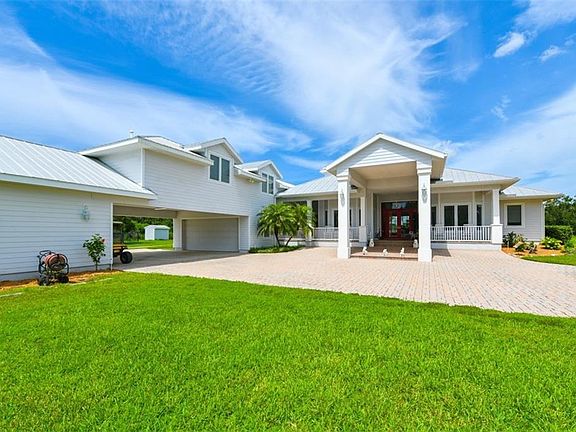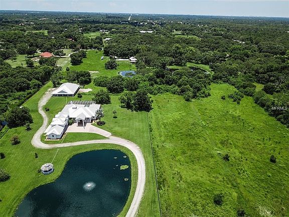 A private estate on 10 acres awaits at the end of a romantic winding drive. Pass the heart-shaped pond with its own gazebo and grazing fields and arrive home to this four-bedroom residence, designed with the perfect blend of form and function. A pavered portico entrance greets guests before stepping inside to soaring tray ceilings, crown molding, and spaces ideal for gracious living. Cook for one or a dozen in the open kitchen with expansive granite island featuring built-in eating space and stainless Kitchenaide appliances. The home uses all-natural gas for the 8-burner stove top, pool heater, and 2 fireplaces. Huge sliders in the great room corner pocket to completely open to the elements. Experience peace of mind with Eagle and PGT windows, hurricane shutters in the lanai, 10,000-watt generator, sprinkler system, intercom system, and electric gate with monitors. Spend endless afternoons on the screened pool terrace with beach entry infinity pool and a salt-generated chlorine system. Live the ultimate equestrian lifestyle with a magnificent barn, complete with 3 high top garage entries alongside of 7 horse stalls, workshop, Nelson automatic watering system with separate fresh water for each section, and equipment storage. You'll appreciate two oversized two-car garages with a covered portico, along with circular driveway and 2-car carport. No HOA. This piece of pastoral paradise is away from the hustle and bustle but close enough for an easy trip into town and the dazzling white-sand beaches of Florida's Gulf Coast.