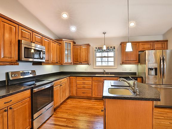If you crave peace & quiet with outstanding views this custom built 4-bedroom, 3 1/2-bathroom home w/a finished walk-out basement is for you! 4440 aprox sq ft of total living space w/a welcoming covered porch offers great scenery amidst the landscaped surroundings. An open floor plan welcomes you w/gorgeous wood flooring. The kitchen is a highlight, featuring a breakfast bar complete w/a wine fridge, center island & custom cabinets. Step out onto the 29x12 covered deck from the kitchen for additional entertainment space & to bask in the beauty of nature. The split bedroom layout provides a generously sized master suite boasting not 1 but 2 walk-in closets! Master bath is luxurious w/ jetted tub, separate shower & dual sinks & it conveniently connects to the covered deck. The other 3 bedrooms are ample in size w/a full bathroom located near them. The LL offers a versatile space w/a workrm, finished family rm & full bath. Fresh paint & new carpeting add to the appeal of this home.