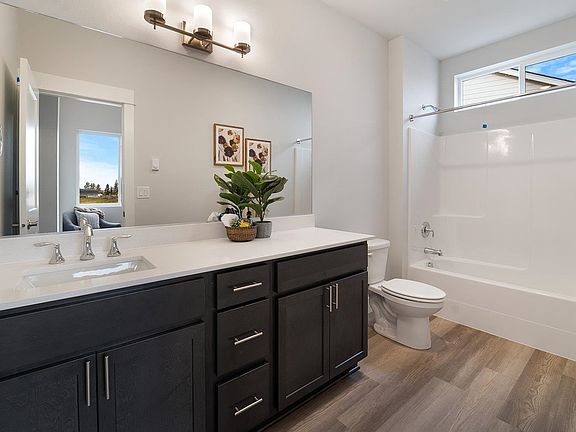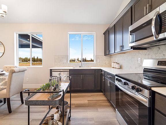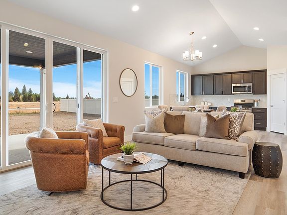 Experience modern living in the Stockton by Azure Northwest Homes, where contemporary elegance meets thoughtful design. This 3-bedroom, 2-bathroom home exudes comfort and style. Step into the open-plan living area, featuring an electric fireplace and a double slider leading to a covered back patio—perfect for entertaining or relaxing. Vaulted ceilings and oversized windows flood the great room with natural light, creating a bright and inviting atmosphere. The kitchen is a chef's dream with 42" upper cabinets, hard surface countertops, stainless steel appliances, and a practical pantry. The bathrooms boast tiled showers and double sinks, offering a touch of luxury. A can light package adds a modern glow throughout the home. Outside, a professionally landscaped front yard enhances the home's curb appeal. The three-car garage provides plenty of parking and storage space. The Stockton perfectly blends sophistication and functionality, elevating your lifestyle to a new level.