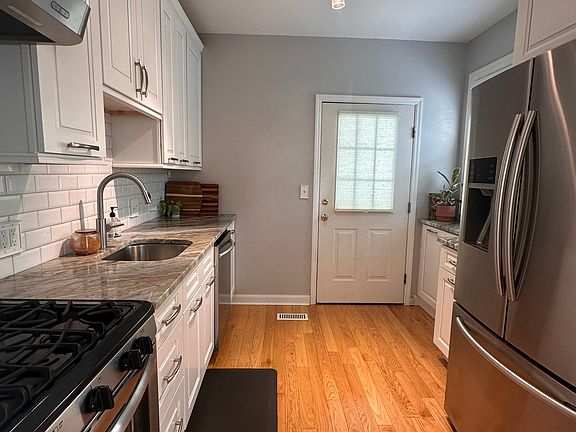 - Galley kitchen with custom cabinetry, subway tile backsplash, granite counters & modern stainless steel appliances