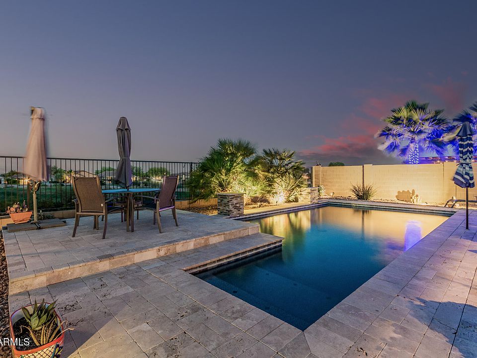 Welcome to your slice of paradise in The Estates at Johnson Ranch! This split-floor plan, 4-bed, 2-bath home sits on the 16th hole of San Tan Highlands Golf Club with beautiful mountain views. The front courtyard is enclosed with travertine and a security gate—ideal for morning coffee. Your kitchen features granite counters, SS appliances, RO system, and water softener. The spacious primary suite offers a walk-in closet, double sinks, and a separate shower and tub. Outdoors, unwind and relax with a heated saltwater pool, travertine patio and turf. The garage features epoxy flooring and cabinets for convenience. Enjoy all Johnson Ranch has to offer with community amenities like pools, spas, golf, tennis, pickleball, and more!