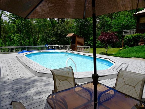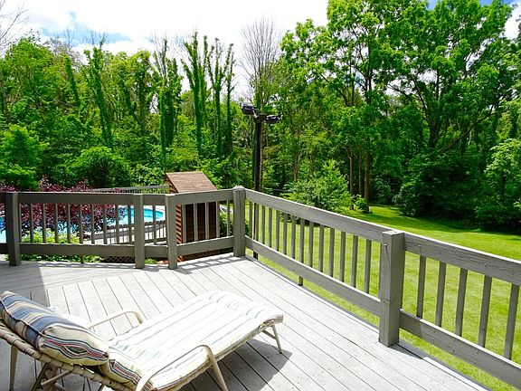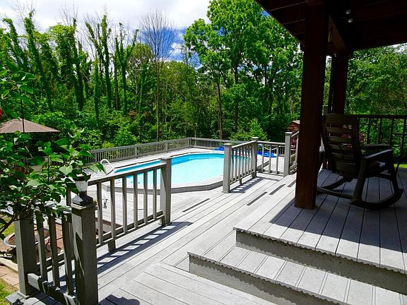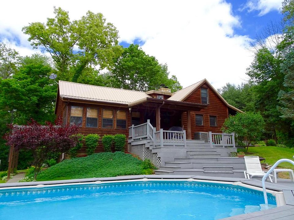 Paradise Found on 18 wooded acres in desirable Fairfield Co. Charming Cedar/Log home w/ metal roof sits approx. 1/4 mile off the road nestled amongst 3,500 Pine Trees. This fine home offers amazing out door living space with 3 covered porches and a private elevated deck off the 3 season room overlooking the pool with all composite decking. 20' x 22' garage plus a 24' x 32' heated outbuilding with workshop. Brand new granite countertops and ceramic tile backsplash in Kitchen. Large first floor Owners' Suite features a whirlpool tub. Vaulted Great Room offers a stone fireplace with wood burning stove and loft. Walk out basement features a recreation room with full bath. Amazing setting with beautiful grounds and landscaping, bridge to shed, Walnut Trees galore, Home has 400 amp. service.