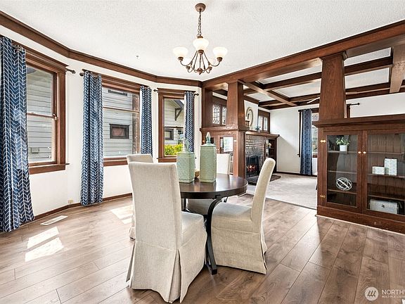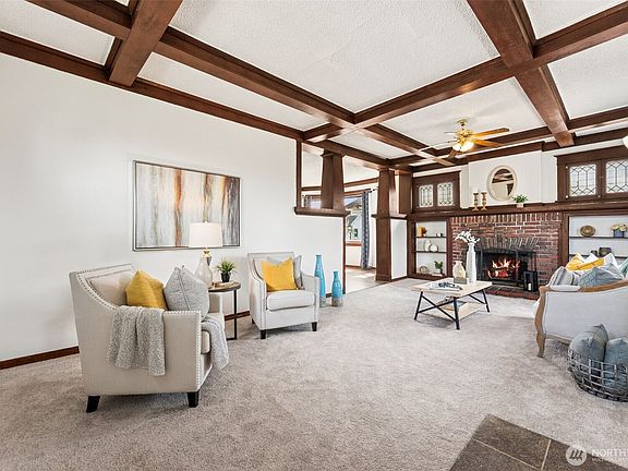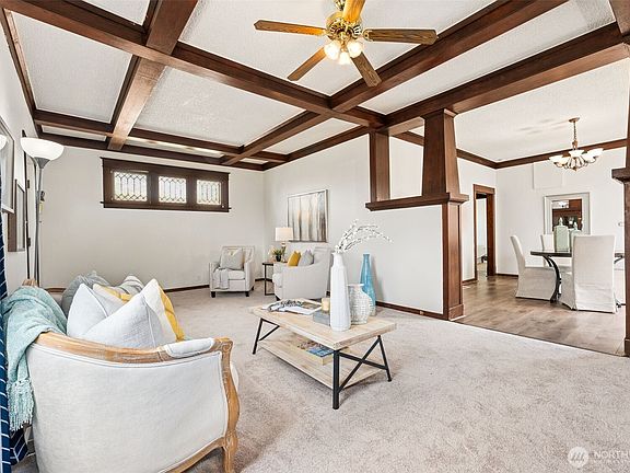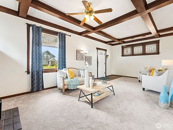 Welcome to your new home in the heart of South Tacoma! This charmer features a welcoming classic craftsman vibe with high box beam ceilings, a cozy fireplace, and original built-ins with leaded glass separating the living room from the huge dining room. With three comfortable bedrooms, an office area and a generous laundry room off the well-appointed bathroom there is plenty of space for everyone. The kitchen is equipped with a butler's pantry and lots of storage, making it ideal for those who love to cook and entertain. Fresh paint and carpet, this home is turnkey and ready for your personal touch. Large level lot with fenced back yard offers space to garden & play while the gate on the alley offers easy access and secure parking.