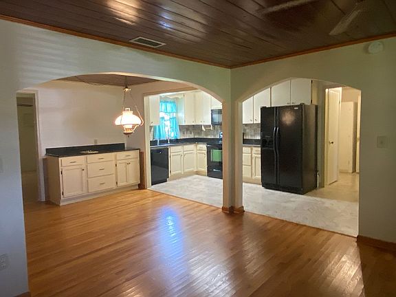 The kitchen has been beautifully updated with granite countertops, a buffet-style serving area, and new stainless steel appliances including a dishwasher, oven, microwave, and refrigerator.