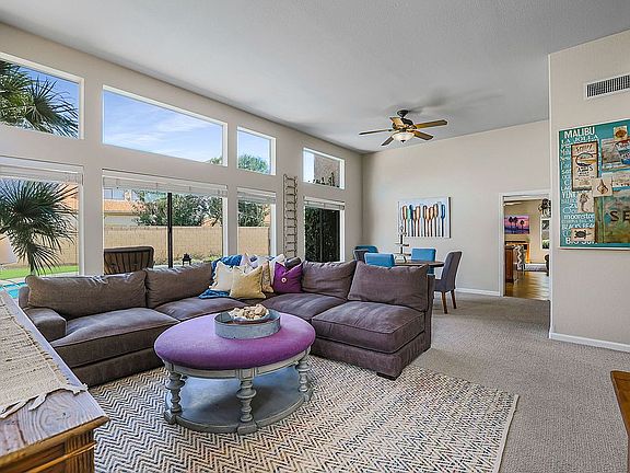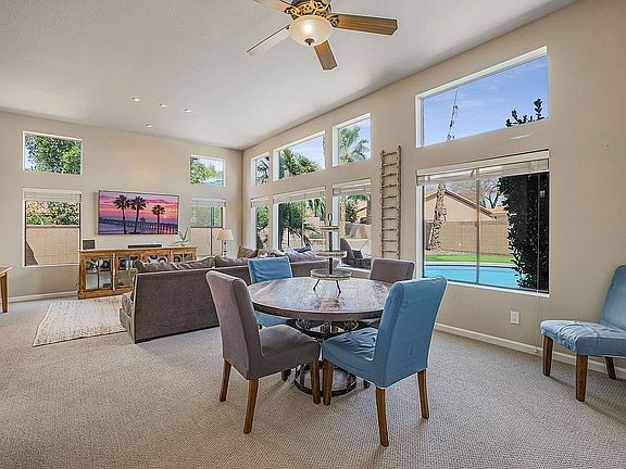 The private, fenced backyard is an entertainer's delight and includes a sparkling pool, built-in gas grill, outdoor dining for 6, 3 hole turf putting green, multi-sport court, large covered patio w/ smart TV & a gas fire pit. Start a game of corn hole on the lawn or challenge a friend to a game of pickle ball!