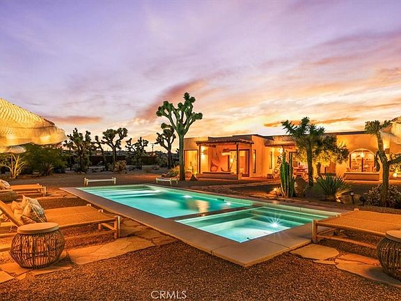 Step into your own private sanctuary in the heart of Yucca Valley—a stunning furnished Moroccan desert-inspired retreat that blends modern luxury with timeless design. This 2-bedroom, 2-bathroom architectural gem spans 1,363 square feet and sits on a serene 2.3-acre lot, offering total privacy and an unmatched desert living experience. From the moment you enter through the electric gate, you’re welcomed into a fully fenced oasis surrounded by native desert landscaping and curated stone walkways. Inside, you'll find sleek concrete floors, custom stone accents, built-ins, and thoughtfully designed living spaces that open seamlessly to the outdoors. The home features private patios, a tranquil inground heated salt water pool and spa, an outdoor fire pit, and shaded lounging areas—perfect for entertaining or unwinding under the stars. New modern architecture is complemented by mini splits for year-round comfort, while a carport adds function and more outdoor opportunities. This is more than just a home—it's a destination. Ideal as a luxury vacation getaway, high-end rental, or full-time desert retreat. Don’t miss the chance to own this truly one-of-a-kind property where style, privacy, and natural beauty meet.