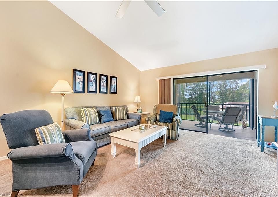 Rarely available 2nd floor END UNIT with vaulted ceilings in Augusta Woods of Lely Country Club. Beautiful views of lush green space, the heated community pool and nearby golf course from your southern exposure lanai that opens up to the great room and master bedroom. Spacious, open kitchen with white cabinets and granite countertops lead to a nicely furnished great room. The under cover parking spot and expansive storage closet is conveniently situated right in front of your condo entryway and even more storage is available in both bedroom walk-in closets. Augusta Woods is perfectly centered about 5 miles from downtown Naples and 6 miles from Marco Island allowing for quick beach access in either direction. The building roof has just been replaced and this condo is offered turn-key furnished and move-in ready. Naples paradise awaits!