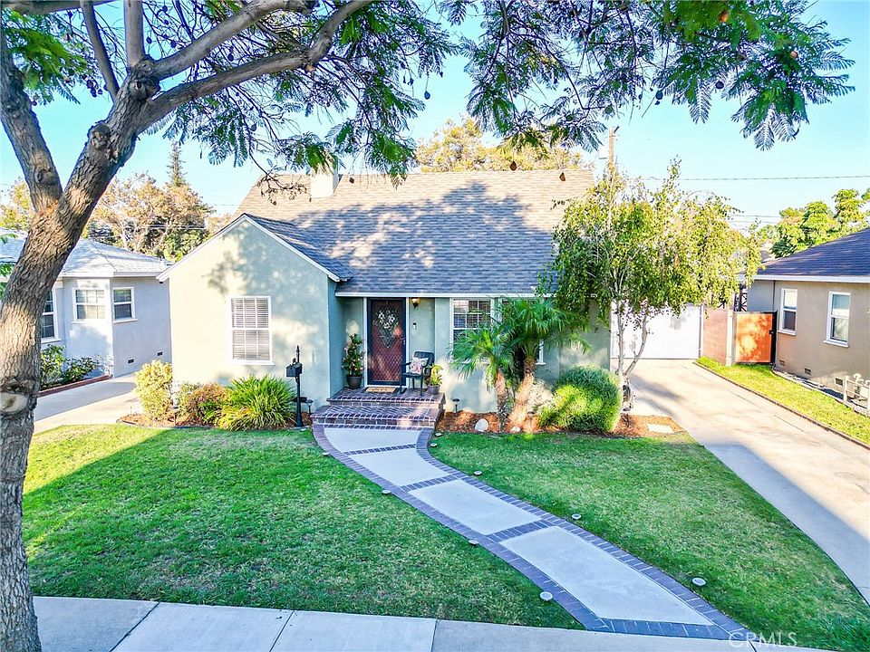 Situated in the heart of Lakewood, this beautifully upgraded 2-bedroom (with optional 3rd bedroom) / 2.25-bath storybook cottage combines curb appeal with exceptional design. The open floor plan features new premium vinyl plank flooring, central heating and air, updated windows, crown molding, open beam ceilings, and wainscoting. The kitchen boasts granite countertops and newer cabinets. The versatile den, currently staged as a spacious study, was previously used as a third bedroom and features privacy glass double doors, a convenient large closet, and powder room nearby. Enjoy the expansive covered patio, lush landscaping, and large bonus room with private entrance behind the detached garage. The bonus room, staged as an office, can easily serve as a guest suite (optional 4th fourth bedroom) with its own closet and bathroom. Additional features include washer and dryer hookups in the detached garage and potential RV parking on the long driveway. Conveniently located near Mayfair Park, shopping, and the 91 Freeway, this home is attractively priced for a quick sale.