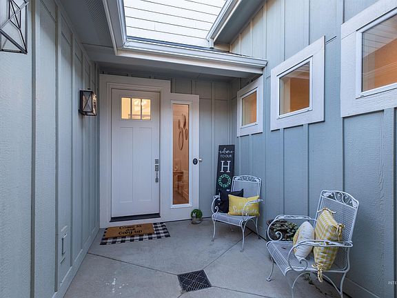 Cozy gas fireplaceBright refreshing spaceBubbling rock fountainCeiling fanQuaint courtyardRaised planter bedCoved ceilings