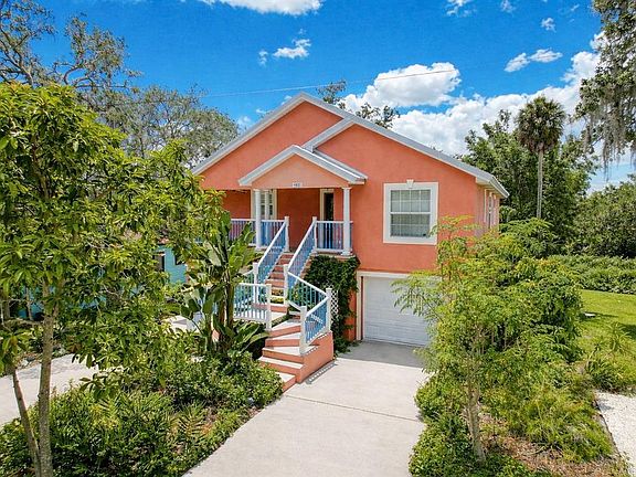 This elevated riverfront home in the heart of downtown New Port Richey, offers a rare blend of privacy, location, and lifestyle. This coastal-inspired residence features an expansive tandem garage with space for multiple vehicles, a golf cart, and water gear, while the elevated floorplan provides peace of mind. Upstairs, an open, light-filled layout showcases high ceilings, walls of glass, and calming views of the Cotee River. A fully retractable slider opens the living space to the outdoors, creating an easy, natural flow with one-of-a-kind views. The kitchen features solid wood cabinetry and quality craftsmanship, and the primary suite includes a walk in closet and an ensuite bath with a garden tub and jetted shower. Two rear balconies overlook the water, complemented by a welcoming front porch and mature tropical landscaping that creates privacy along the river. A floating dock installed in 2019 offers direct access for kayaking, fishing, or relaxing by the water, with major updates including a new metal roof and HVAC system in 2023. Located near downtown shops, restaurants, parks, and events, this is a rare opportunity to experience elevated, riverfront living in a walkable downtown setting that truly needs to be seen and experienced in person. (Roof 2023, AC 2023, Dock 2019)