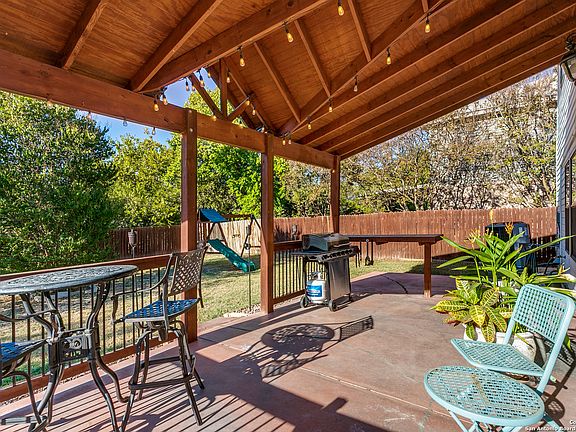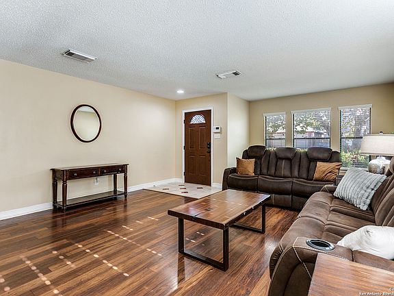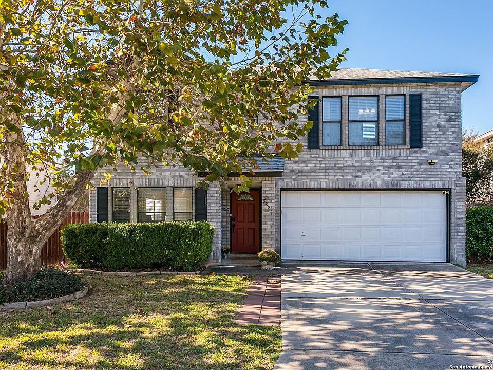 Welcome to this beautiful and spacious two-story home, featuring a charming brick facade and perfectly situated on a charming, tree-lined street. The main level is dedicated to communal spaces, offering a seamless flow from the living room to an expansive dining and kitchen area. This space is complemented by a well-appointed half bath, ensuring privacy for all bedrooms located upstairs. The island kitchen is perfect for gatherings, equipped with abundant cabinetry, recessed lighting, and a large island. Its open-concept design connects effortlessly to the dining area, ideal for serving family meals and enjoying game nights with friends and loved ones. Upstairs, a bonus room provides versatility for a secondary living area, a game room, a home office, or even a hobby/craft space. Generously sized, the primary bedroom offers the flexibility to create an owner's private sanctuary with separate sleeping and lounging areas. It also includes an ensuite bath and a walk-in closet. The secondary bedrooms enjoy a beautifully reimagined full bath, featuring a soaking tub and impressive glass doors. Stepping outside to your private backyard oasis, you'll find an expansive yard accompanied by an inviting covered patio with an al fresco extension, all framed by views of the surrounding mature trees. A convenient storage shed allows the garage to remain available for vehicle parking. The home enjoys added privacy similar to a corner lot, as it is bordered by a common walking path on the west side, ensuring no shared fence line with the adjacent neighbor. This convenient path leads directly to Stahl Elementary, with Harris Middle School just 1.5 miles away, and Madison High School about half a mile away. Enjoy added convenience of HEB only 1.5 miles down the road, and a quick 7-minute drive to Rolling Oaks Mall, Walmart, and numerous dining options. The home also offers easy access to 1604, I-35, and Loop 410, with the airport just 15 minutes away making commuting and traveling a breeze. Your dream home awaits - schedule a showing to experience the beauty, functionality, and convenience this home offers!