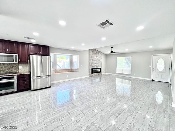 Sleek stainless steel appliancesCovered patioElegant granite countertopsExpansive backyardCozy electric fireplaceOpen-concept design